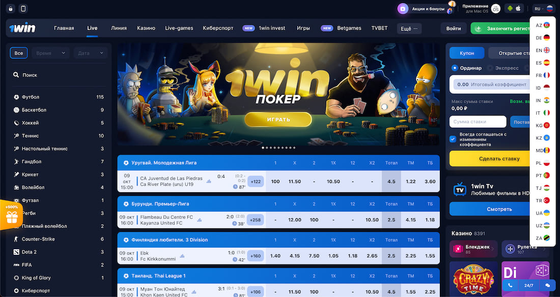 Основные разделы – «Спорт», «Казино», «Live-casino», «Киберспорт» и «Live».